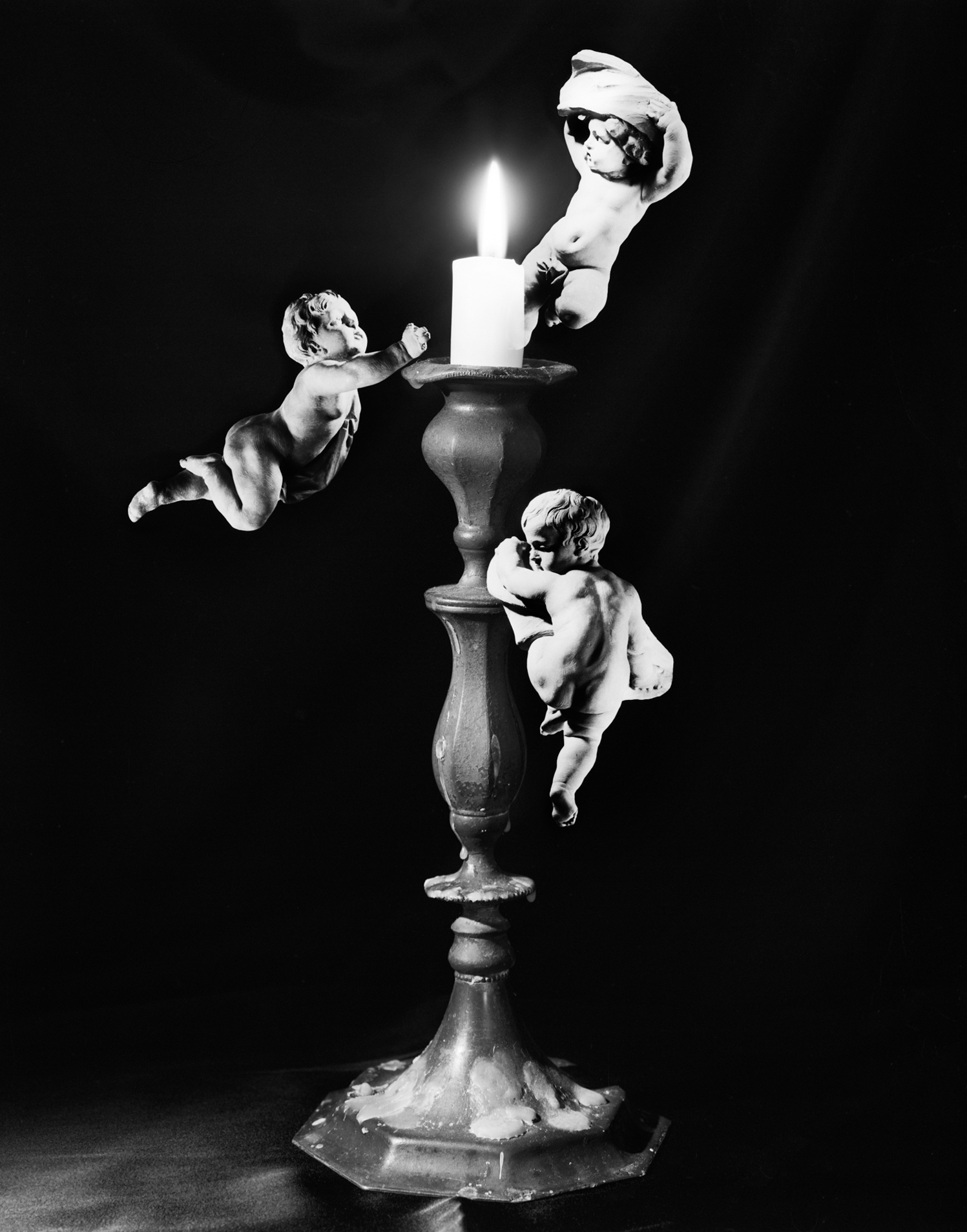 Putto began three years ago when I assembled an archive of master drawings and sculptures depicting these childhood sprites, many of which would later become subjects in my photographs. I became transfixed by the duality of the putto’s absolute ubiquity throughout art history yet its absent representation today . From the cradle to the grade, the putto has kept guard over mankind. He stands and mourns beside the bier, bedecks the tomb with garlands, or proclaims the glories of the dead. The putto has played their biggest role in the decoration of churches, they flutter onto the altars and tabernacles and look down from some high ledge, laughing into the abyss with no thought of danger. The putto is art’s authentic goblin, summoned into existence by the artist, reflecting valuable representational insights to be viewed.